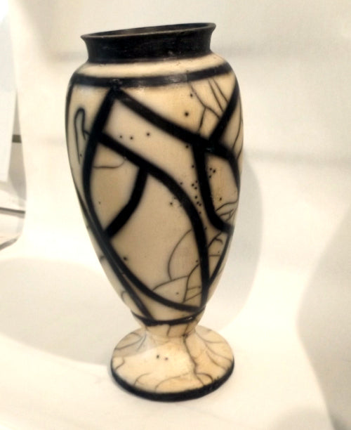 This stunning Naked Raku vase is made by George Thom, a potter that has been with us for many years and is somewhat a specialist in the Raku technique.