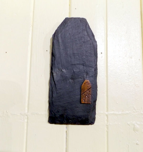 This is an unique artform, metal on slate and that is something Ian Dickie does well. This small wall hanger has a copper house.. Perfect house decoration.