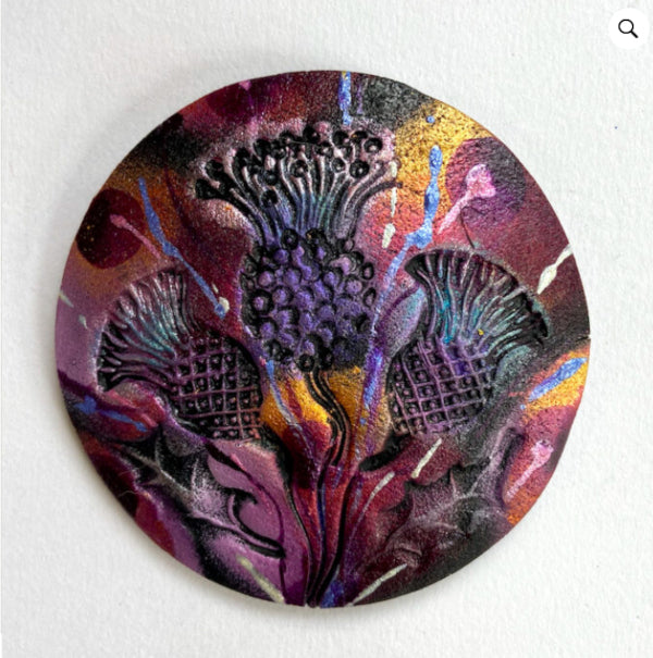 Thistle – Inspired by the native Scottish thistle and known as The Emblem of Scotland, this beautiful thistle grows prolifically throughout the Scottish landscape. Three embossed thistles highlighted with multi colours.